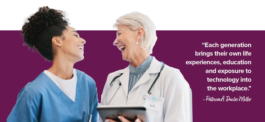 “Each generation brings their own life experiences, education and exposure to technology into the workplace,” says Patricia A. Duclos-Miller, MSN, RN, NE-BC, nursing professional development specialist at Bristol Hospital in Bristol, Connecticut. “Hence, unconscious biases may interfere with working together as we hold onto our own generation’s preferences, work and life experiences.”