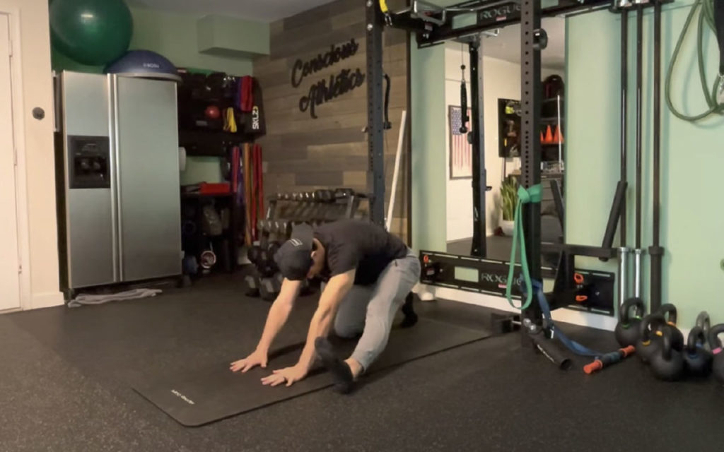 The first move I call an initial hip opener (youtu.be/LYotgCfEM-s). There are two critical muscle groups that heavily affect the hips – your adductors (inner thighs) and hamstrings. With this exercise you’ll be able to target both during different phases of the movement. We want to start in a quadruped position, start by bringing your left leg up close to your left hand. Remove your left hand from the ground and place it on your knee if you need help with a little bit of balance. In this exaggerated kneeling split position, you should feel a stretch in your left inner thigh. Try to keep your chest up and drive your hips toward the ground. In order to target the hamstring of the same left leg, we will transition by sitting the butt back, allowing the left leg to straighten as we do so. This will provide a deep stretch in your left hamstring and, in order to maintain balance, simply place your left hand back on the ground to help maintain stability. Then, return back to that forward kneeling position allowing your left knee to bend.