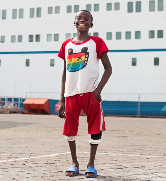 By uniting volunteers from around the world, Mercy Ships was able to provide several complex surgeries for Ulrich on one of the hospital ships that Mercy Ships operates in Africa, which straightened his legs. Now standing tall, his life has been transformed and is filled with hope.