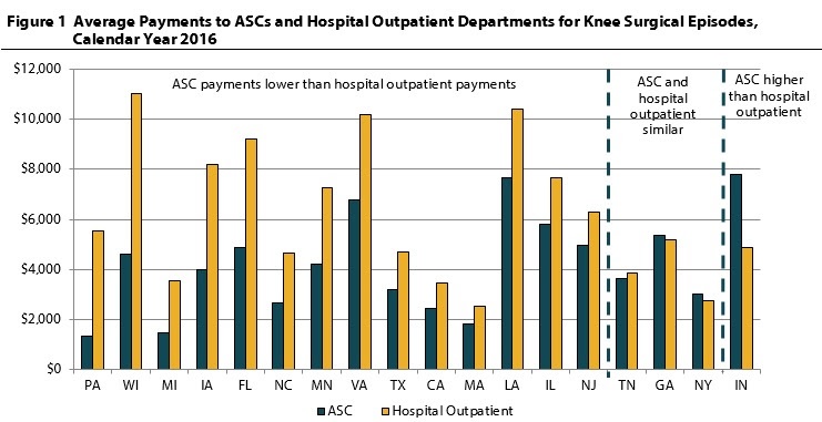 • In 14 states, payments for knee surgeries done at ASCs were at least 21 percent lower than payments for hospital outpatient surgeries in 2016. In 3 states, the payments were similar, and in Indiana, payments for ASC surgeries were 59 percent higher than payments for hospital outpatient surgeries. Similar results were found for shoulder surgeries.