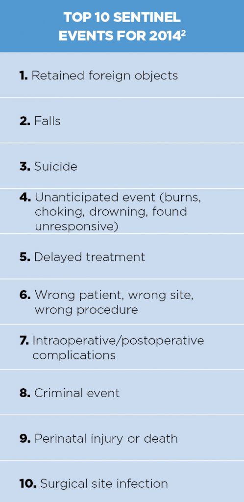 2. Punke H. Top 10 sentinel events in 2014. Becker’s Infection Control & Clinical Quality. June 4, 2015. http://www.beckershospitalreview.com/quality/top-10-sentinel-events-in-2014.html. Accessed May 10, 2016.