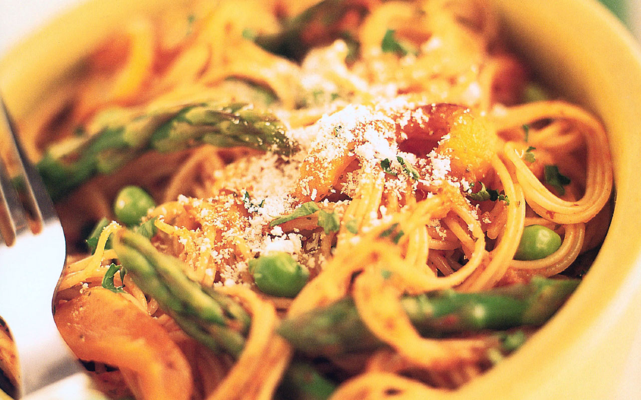 Picture a plate of pasta with an array of colors: green asparagus and peas, yellow sweet peppers and red tomato sauce sprinkled with straw-colored freshly grated Parmesan cheese. This is a dish that can deliver some much-needed cheer. Don’t worry if you can’t find some of the ingredients. Just use what is available.