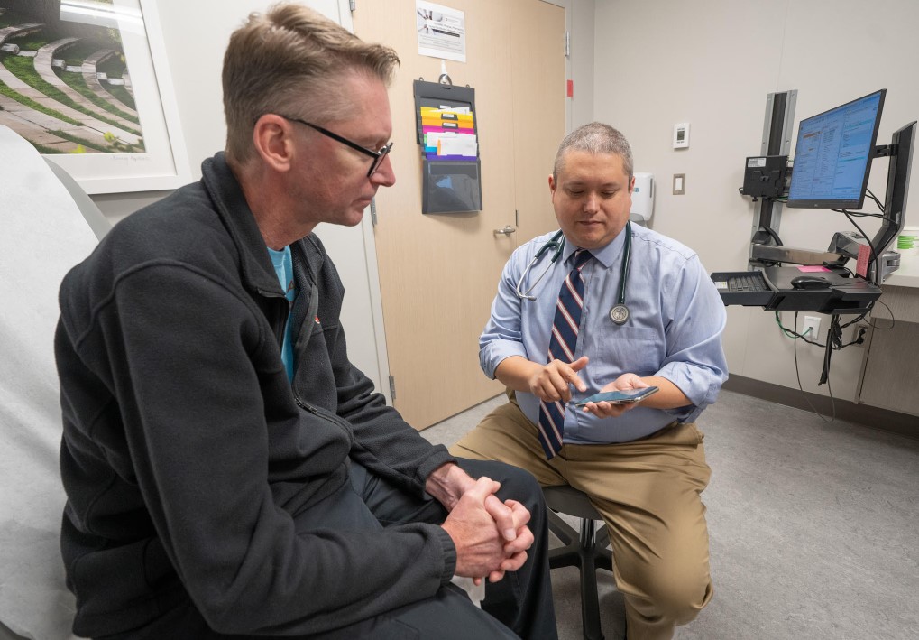 Harrison Jackson, MD, explains the ambient listening app that he uses in appointments to his patient at The Ohio State University Wexner Medical Center.
