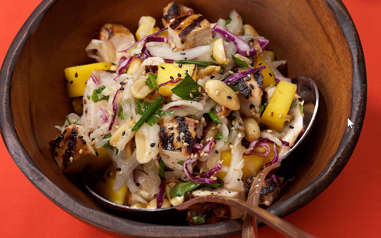 Improve metabolism and energize with this delicious Asian Chicken Salad. Chicken is a great source of lean protein, which helps keep your appetite in check and maintain muscle mass. In my version of Chinese chicken salad, I use mangoes instead of Mandarin oranges. The base of the dressing is a bottled sweet chili sauce. The crispy noodles, though not very healthy, are fun in moderation.