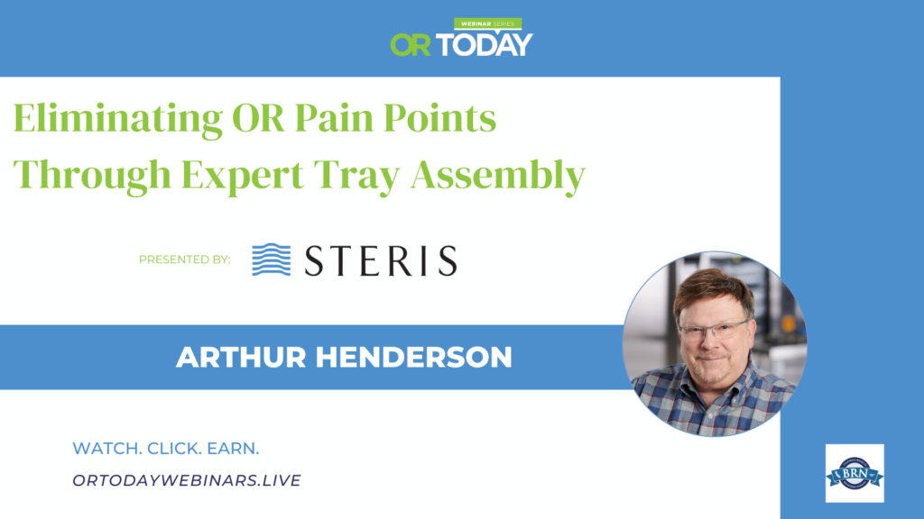 The recent OR Today webinar “Webinar Explores Eliminating OR Pain Points Through Expert Tray Assembly” sponsored by STERIS is eligible for 1 CE credit. OR Today is approved and licensed to be a Continuing Education Provider with the California Board of Registered Nurses, License #16623. This webinar is also eligible for HSPA:1.0 CE Ref: STERIS 242003; CBSPD:1.0 Ref: 00423MMCORPW24; BASC:1.0 AUE & IPCH, PROVIDER #1417 and CBRN 1.0 CE, PROVIDER #CEP11681.